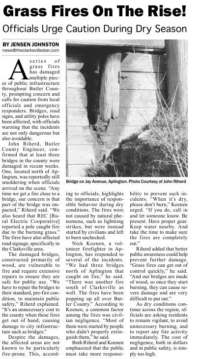 The Butler County Tribune • 1st May 2025 Grass Fires On The Rise! During a meeting of the Board of Supervisors for Butler County a discussion was had about a series of grass fires that had caused infrastructure damage to several bridges throughout the county.