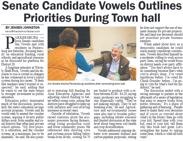 The Butler County Tribune • 26th February 2026 Senate Candidate Vowels Outlines Priorities During Town Hall Jim Vowels, a teacher at Waverly - Shellrock held a townhall introducing himself to the people of district 29 ahead of his campaign for Iowa Senate.