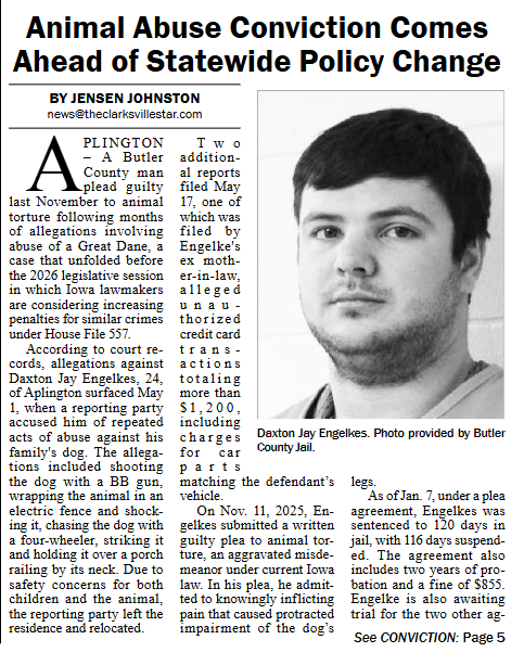 The Butler County Tribune • 19th February 2026 Animal Abuse Conviction Comes Ahead of Statewide Policy Change An Aplington man plead guilty on an animal torture charge just before a house file would escalate the punishment from misdemeanor to felony.