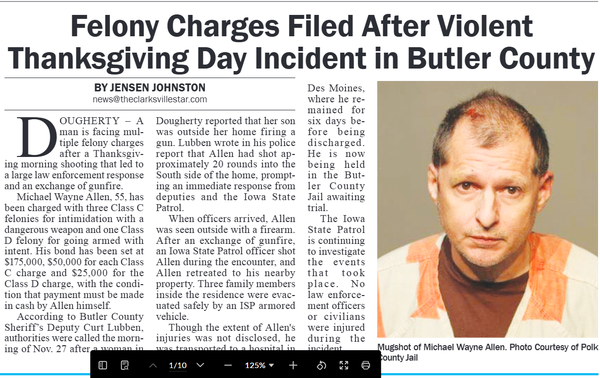 The Butler County Tribune • 11th December 2025 Felony Charges Filed After Violent Thanksgiving Day Incident in Butler County Thanksgiving took a dark turn for a Dougherty family when one member began firing, leading to a standoff with police.