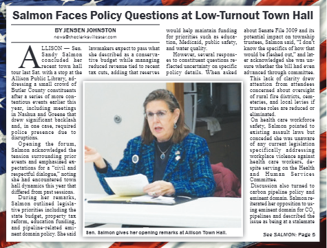 The Butler County Tribune • 5th March 2026 Salmon Faces Policy Questions at Low-Turnout Town Hall Sandy Salmon, Iowa Senator of district 29, answered questions at a townhall in Allison.