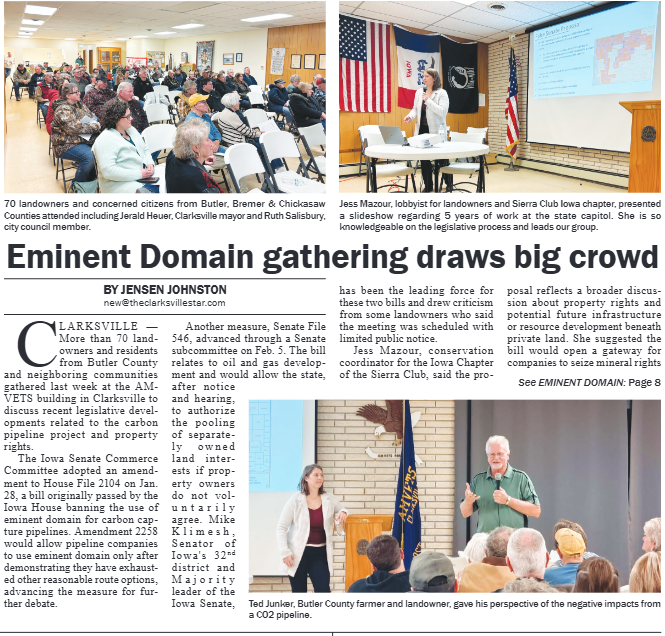 The Butler County Tribune • 12th February 2026 Eminent Domain Gathering Draws Big Crowd A gathering in Clarksville drew large support as discussion's over eminent domain legislation continues.