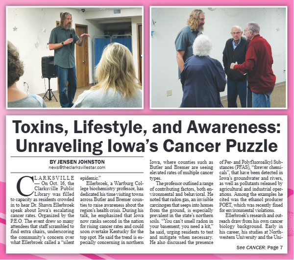 The Butler County Tribune • 23rd October 2025 Toxins, Lifestyle, and Awareness: Unraveling Iowa's Cancer Puzzle Dr. Shawn Ellerbroek, Iowa House Representative Candidate and cancer research professor at Wartburg College, went across Iowa to speak with rural communties about rising cancer risks and Iowa's number 2 spot for cancer diagnosis.