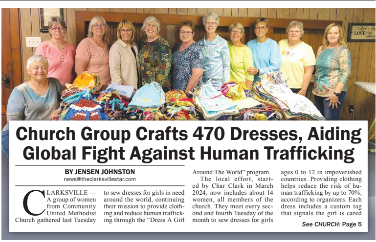 The Butler County Tribune • 5th June 2025 Church Group Crafts 470 Dresses, Aiding Global Fight Against Human Trafficking A group associated with a local church in Clarksville have been crafting dresses that help with clothing needs and combat human trafficking in undeveloped nations.