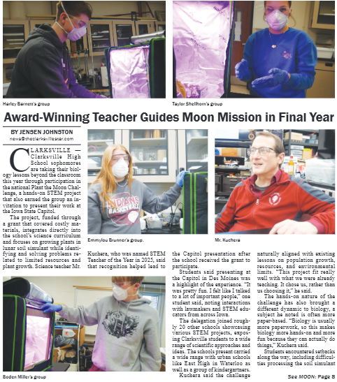 The Butler County Tribune • 5th March 2026 Award-Winning Teacher Guides Moon Mission in Final Year Mr. Kuchera and his Sophmore class started the Plant The Moon Challenge this semester, presenting their projects at the Iowa State Capitol building in Des Moines.