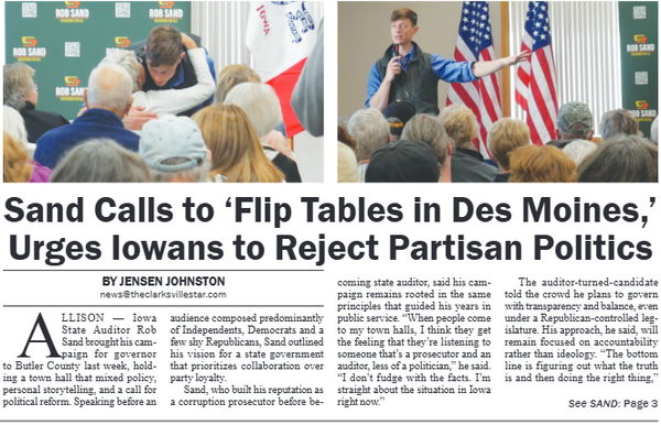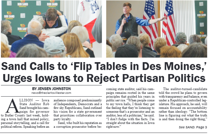 The Butler County Tribune • 30th October 2025 Sand Calls to 'Flip Tables in Des Moines Rob Sand conducted a town hall in Butler County, speaking with the paper and citizens after announcing his campaign for Governor.