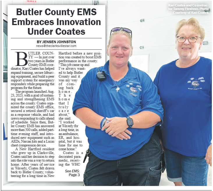 The Butler County Tribune • 2nd October 2025 Butler County EMS Embraces Innovation Under Coates Two years after Kari Coates took the position of EMS Coordinator, The Tribune gave an update to inform the public of the departments state under her leadership.