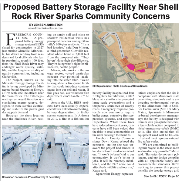 The Butler County Tribune • 8th May 2025 Proposed Battery Storage Facility Near Shell Rock River Sparks Community Concerns Legal disputes arose during discussion of a proposed battery plant sparking community outrage and leading to local government intervention.