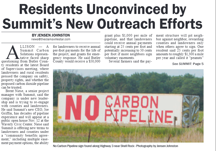 The Butler County Tribune • 6th November 2025 Residents Unconvinced by Summit's New Outreach Efforts Tension rose between landowners and Summit's Carbon Pipeline project during a Board of Supervisors meeting where a representative of the project was met with angry farmers and citizens in the rural community.