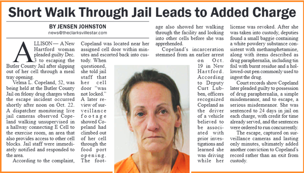 The Butler County Tribune • 1st January 2026 Short Walk Through Jail Leads to Added Charge An inmate at the Butler County Jail escaped from her cell through the food tray slot, causing brief panick among jail staff.